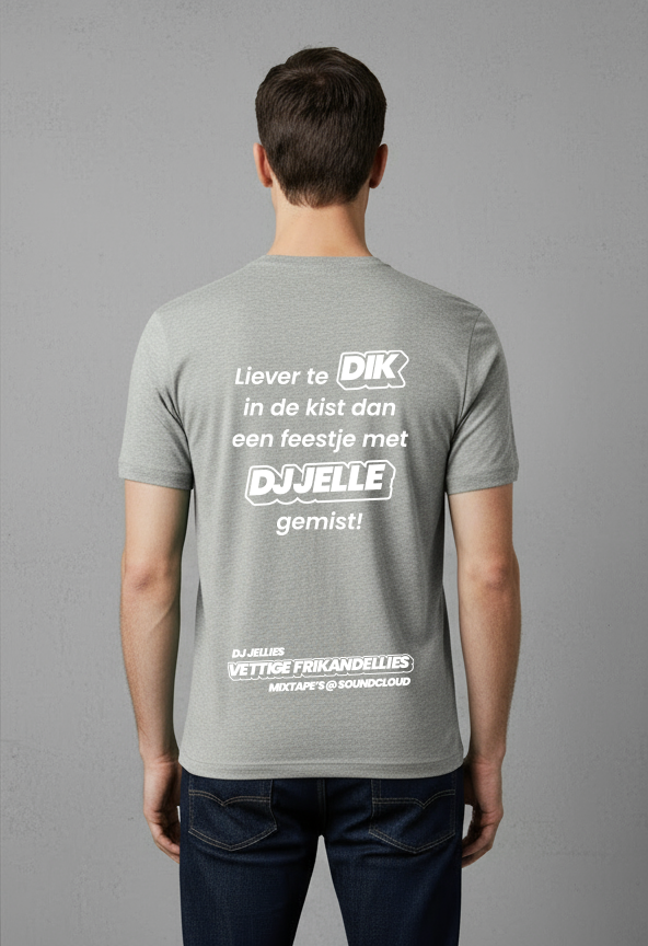 T-shirt 'Liever te dik in de kist dan een feestje met Dj Jelle gemist'
